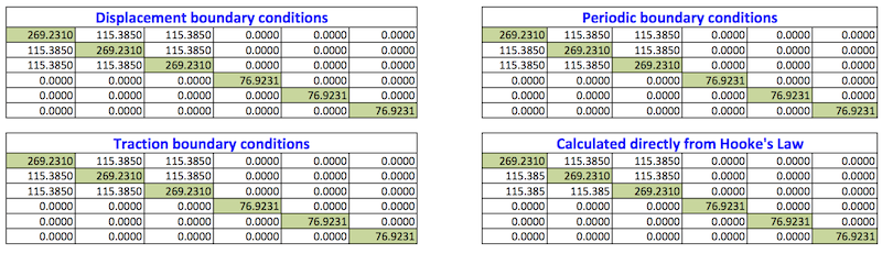 The commands for the calculation of e.g. the first column of the homogenised stiffness matrix for the displacement, periodic and traction boundary conditions for this example is given as