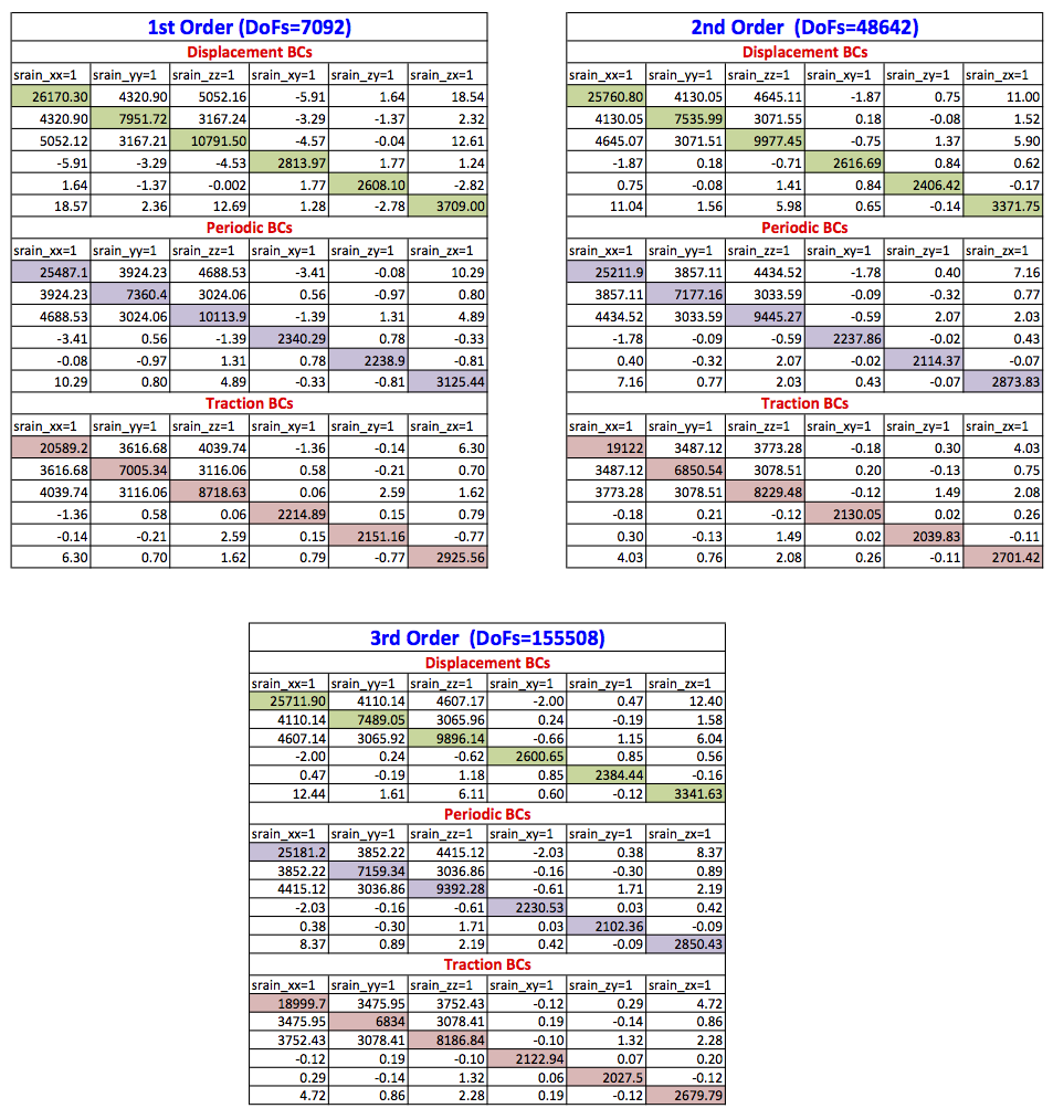 Comparison of C11, C22, C33, C44, C55 and C66 for displacement, traction and periodic boundary conditions for this example are shown in the following figure. It is clear that response for the periodic boundary conditions case lies between the displacement and traction boundary conditions cases. Convergence can also be observed in C11, C22, C33, C44, C55 and C66 as we increase the order of approximation from 1st to 3rd.