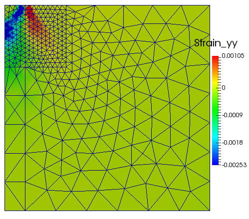 The output \(\varepsilon_{yy}\) and load-displacement curve are shown in the following figures. For comparison the analytical solution for the limiting load is also given in the load-displacement plot.